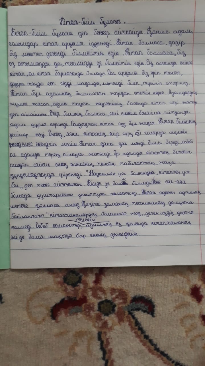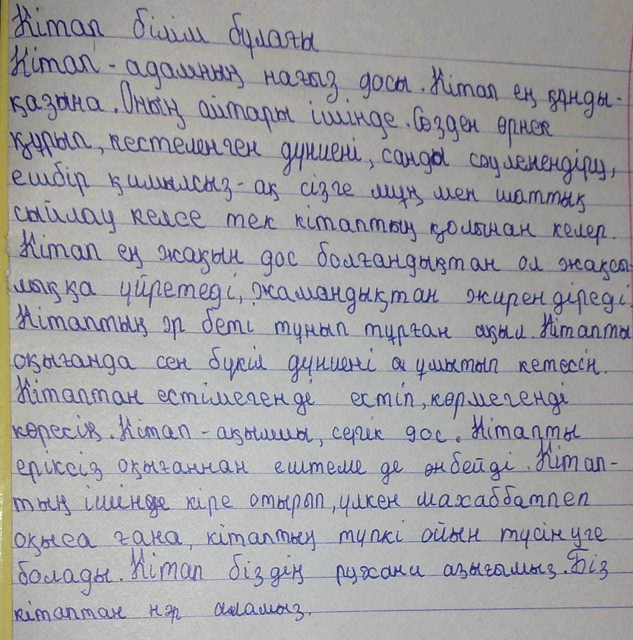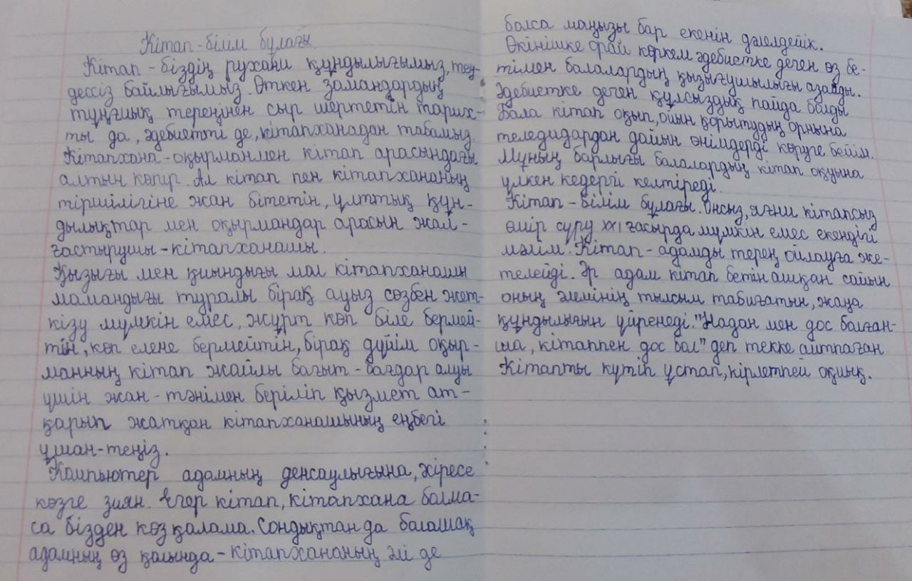 № 4 Қарауылкелді орта мектеп-гимназиясында «Оқуға құштар мектеп»жобасы аясында наурыз айында «Кітап – білім бұлағы» тақырыбында 5 сыныптар арасында эссе жазылды. Эссе жазудағы мақсат – оқушылардың кітап туралы көзқарасын,ойын жинақтау, қағаз бетіне көркем сөзбен жеткізуге дағдыландыру.